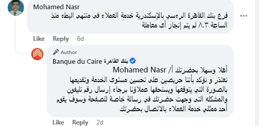 وقال أحد عملاء بنك القاهرة في تعليق على صفحة المصرف الرسمية على موقع "فيسبوك"،: "فرع بنك القاهرة الرئيسي بالإسكندرية خدمة العملاء فى منتهى البطء منذ الساعة 8.30 لم يتم إنجاز أى معاملة".