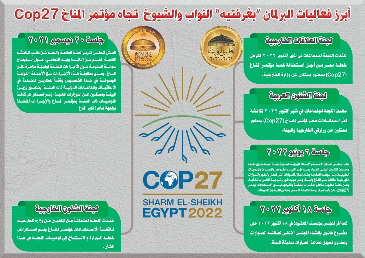 حَرص البرلمان "بغرفتيه" النواب والشيوخ، خلال الفترة الماضية، من خلال لجان العلاقات الخارجية والشئون العربية على عقد عددٍ من الاجتماعات بحضور ممثلين عن وزارتي الخارجية والبيئة لمناقشة الاستعدادات النهائية لاستضافة مصر لمؤتمر المناخ، بالإضافة للجهود البرلمانية "الرقابية والتشريعية" لإصدار قوانين ترسخ للحفاظ على البيئة بما يتسق مع رعاية مصر لمؤتمر الأمم المتحدة الخاص بالمناخ Cop 27 المنعقد فى مدينة شرم الشيخ، كان من أبرزها: