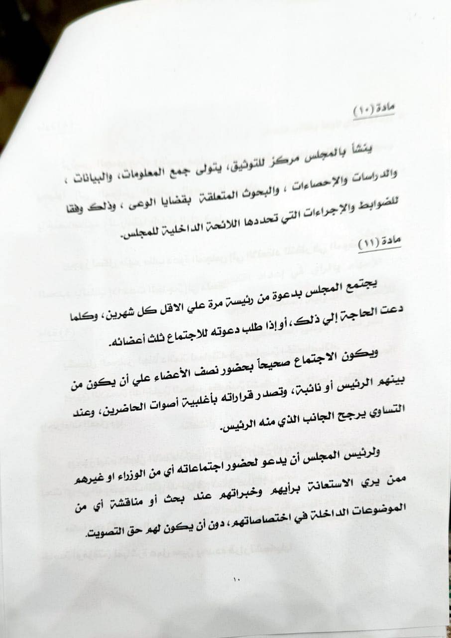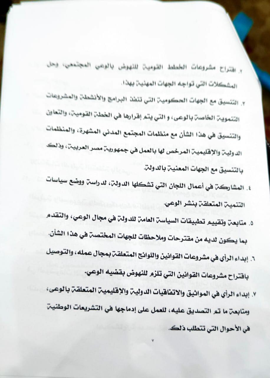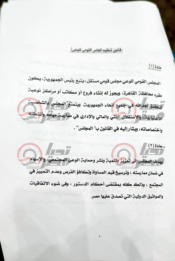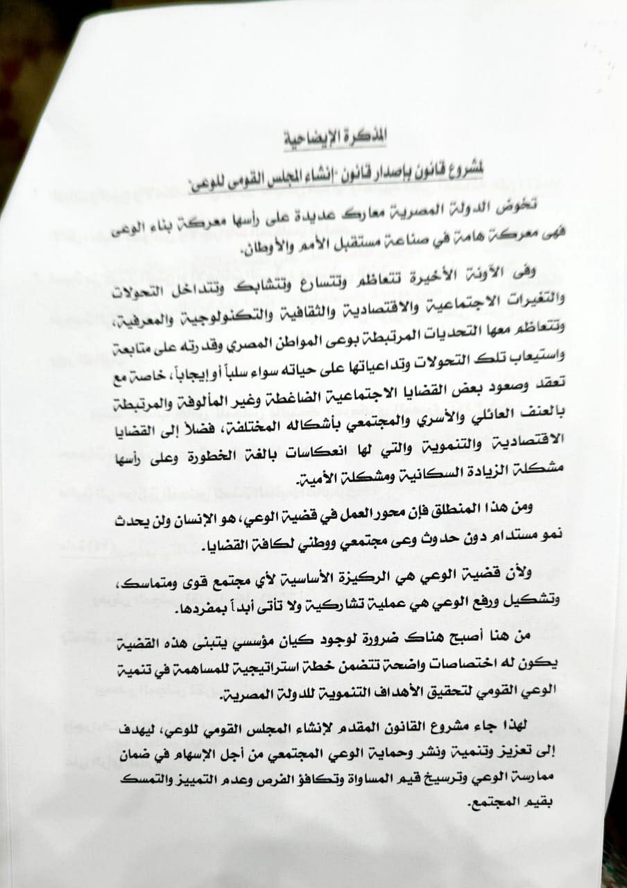 وأكد على أن مشروع القانون يتشمن قانون المجلس القومى للوعى يتكون من ٣ مواد إصدار و٢٢ مادة موضوعية، فيما قال طارق رضوان أن مشروع قانون انشاء المجلس القومى للوعى، فى مجمله فكره جيدة جدا، مقترحا أن يتم تغير المسمى لأن الهدف الرئيسى للدولة هو بناء الانسان، ولا سبيل لذلك الا برفع للوعى، مع مراعاة عنصر السرعة والمرونة.
