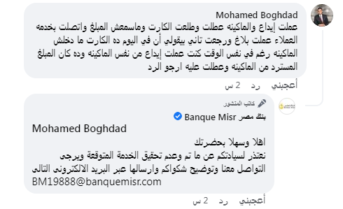 عميل بنك مصر يعلق: "الماكينة مطلعتش الفلوس وسحبتها من الرصيد"