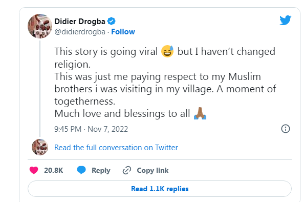 انتشرت في الساعات الأخيرة على مواقع التواصل الاجتماعي، صورللإيفواري ديدييه دروجبا، نجم تشيلسي السابق، تشير إلى اعتناقه الدين الإسلامي، حيث أظهرت الصور أنه يقرأ الفاتحة.