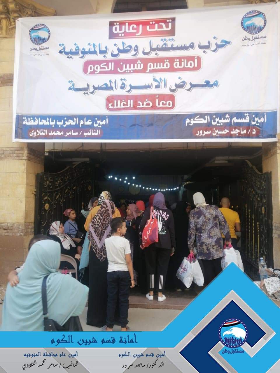وفي محافظة المنوفية،تواصل أمانة قسم شبين الكوم، في إقامة معارض الأسرة، لبيع كافة احتياجات الأسرة المصرية بأسعار مخفضة، تحت شعار "معا ضد الغلاء"، بنسخته الثالثة في قاعة موفي مون، وشملت المعروضات "الملابس وأحذية وأدوات كهربية وسجاد وأدوات مكتب وغيرها من المنتجات"، وشهد المعرض إقبالًا كبيرًا من المواطنين على السلع الموجودة داخل المعرض ولاقى المعرض الترحيب بجهود الحزب في تنظيم المعرض.