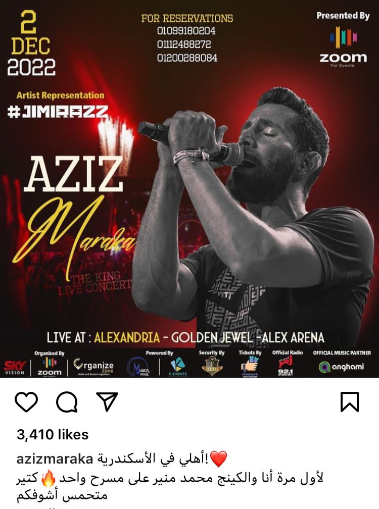 وأعلن عزيز مرقة عبر انستجرام عن موعد الحفل، وذلك يوم الجمعة الموافق 2 ديسمبر في اليكس ارينا - جولدن جويل، بسيدي جابر على البحر.