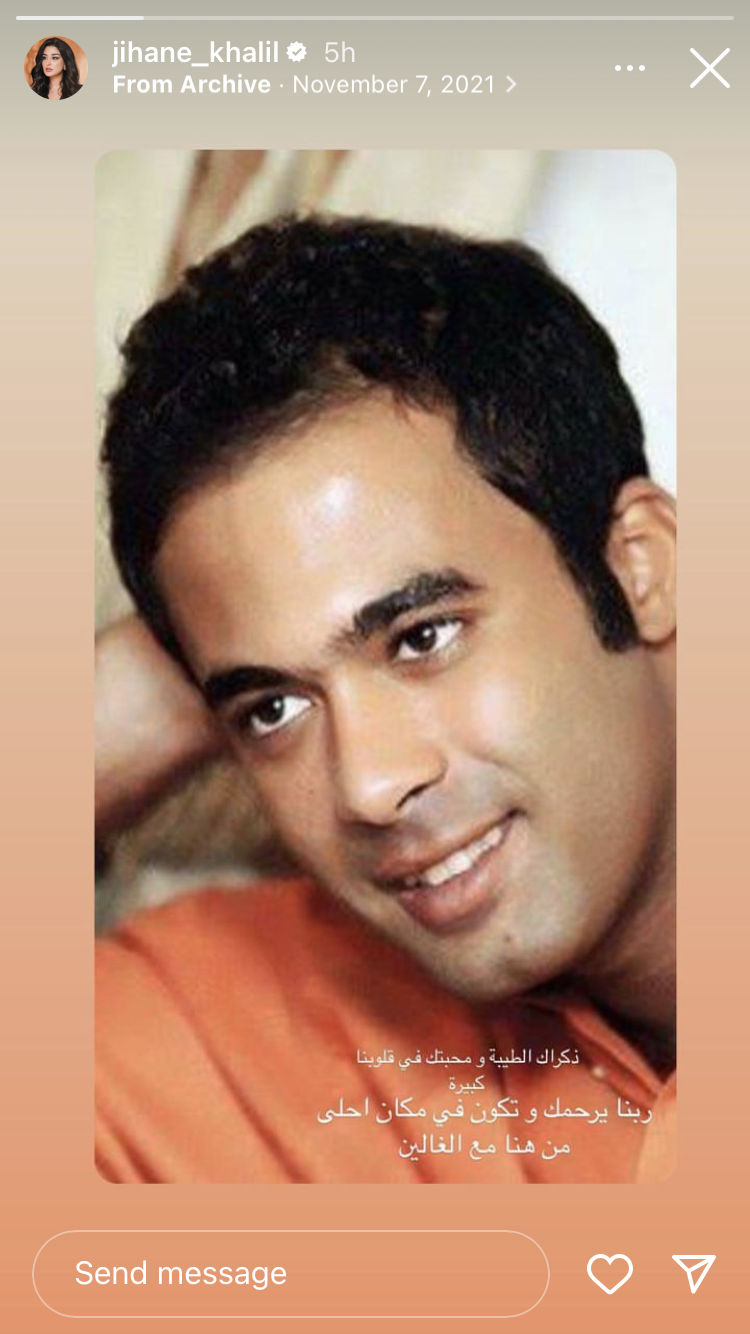 حرصت الفنانة المغربية جيهان خليل على إحياء ذكرى وفاة الشاب الراحل هيثم أحمد زكي وذلك عبر حسابها بانستجرام.