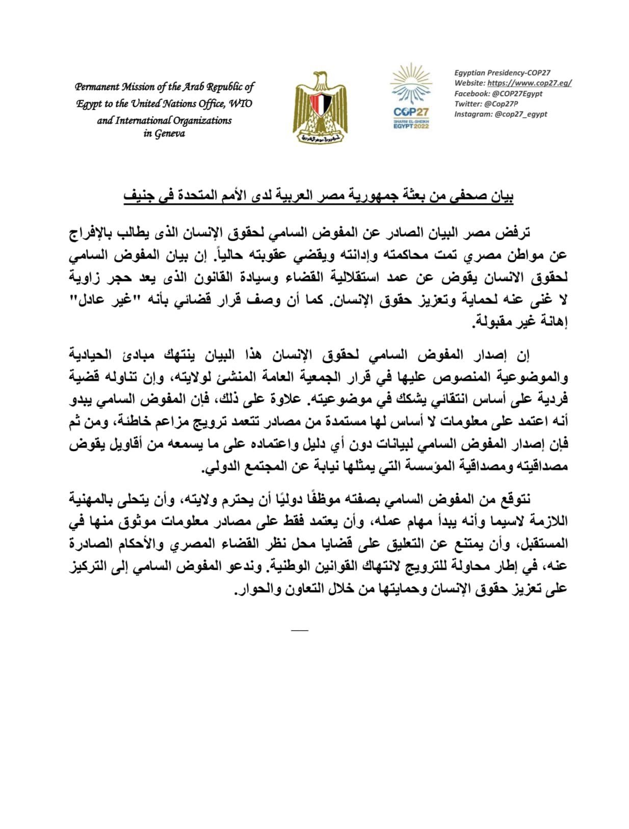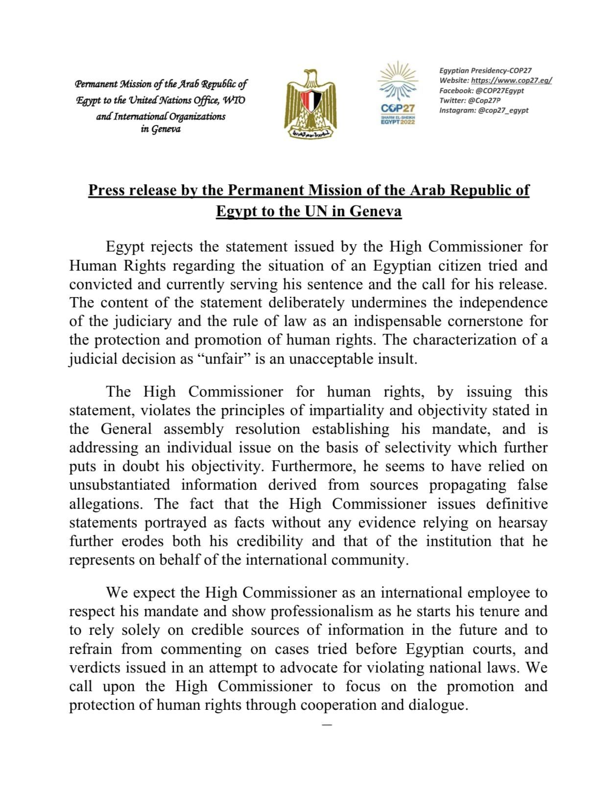 أعلنت بعثة جمهورية مصر العربية لدى الأمم المتحدة في جنيف، عن رفضها البيان الصادر عن المفوض السامي لحقوق الإنسان الذي يطالب بالإفراج عن مواطن مصري تمت محاكمته وإدانته ويقضي عقوبته حالياً، لافته أن بيان المفوض السامي لحقوق الانسان يقوض عن عمد استقلالية القضاء وسيادة القانون الذي يعد حجر زاوية لا غنى عنه لحماية وتعزيز حقوق الإنسان، كما أن وصف قرار قضائي بأنه "غير عادل" إهانة غير مقبولة.
