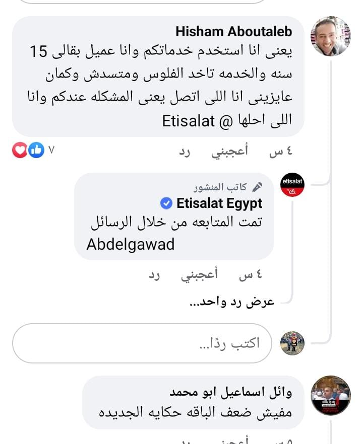 وقال عميل اتصالات مصر في تعليق على صفحة الشركة الرسمية على موقع "فيسبوك"،: "يعنى أنا استخدم خدماتكم وأنا عميل بقالى 15 سنة والخدمة تاخد الفلوس ومتسدش وكمان عايزينى أنا اللى اتصل يعنى المشكلة عندكم وأنا اللى حلها Etisalat".