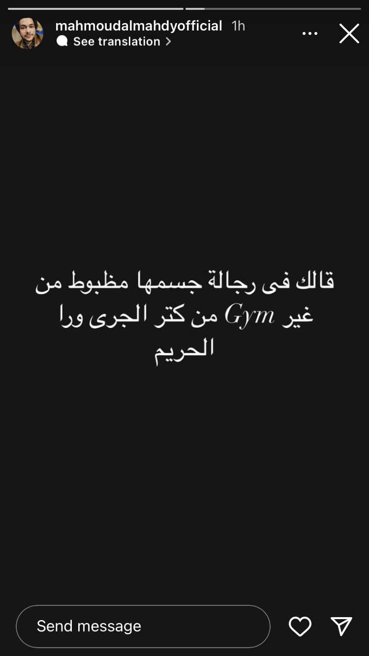 وكتب محمود المهدي عبر خاصية ستوري بحسابه الرسمي بانستجرام: في رجالة جسمها مظبوط من غير Gym من كتر الجري ورا الحريم.