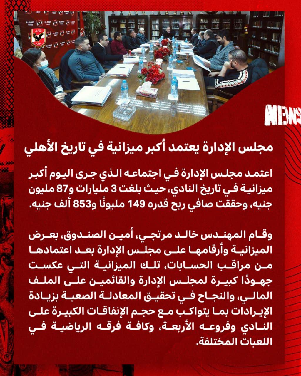 اعتمد مجلس إدارة النادي الأهلي برئاسة محمود الخطيب، في اجتماعه الذي جرى اليوم أكبر ميزانية في تاريخ النادي، حيث بلغت 3 مليارات و87 مليون جنيه، وحققت صافي ربح قدره 149 مليونًا و853 ألف جنيه.