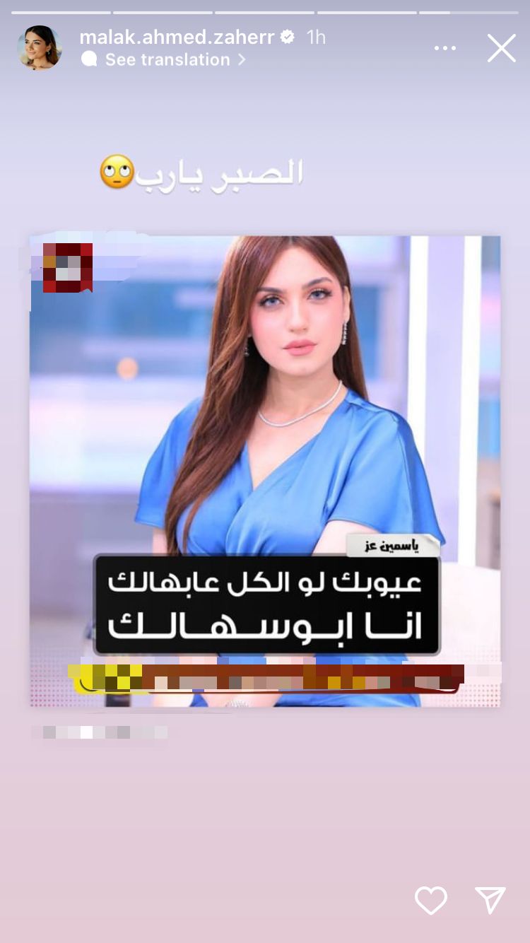 وشاركت ملك زاهر تصريح “عيوبك لو الكل عابهالك أنا ابوسهالك” الذي قالته ياسمين عز خلال حلقتها الأخيرة، وعلقت: الصبر يارب.