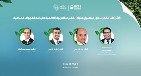 شارك النائب محمد عبد العزيز وكيل لجنة حقوق الإنسان بمجلس النواب عضو تنسيقية شباب الأحزاب والسياسيين، متحدثا بجلسة نقاشية نظمها المركز المصري للدراسات الاستراتيجية ضمن فاعليات مؤتمر المناخ COP27 المعنقد بشرم الشيخ، وكانت الجلسة بعنوان الشركات الخضراء "دور التنسيق وتبادل الخبرات الحزبية العالمية فى سد الفجوات المناخية".