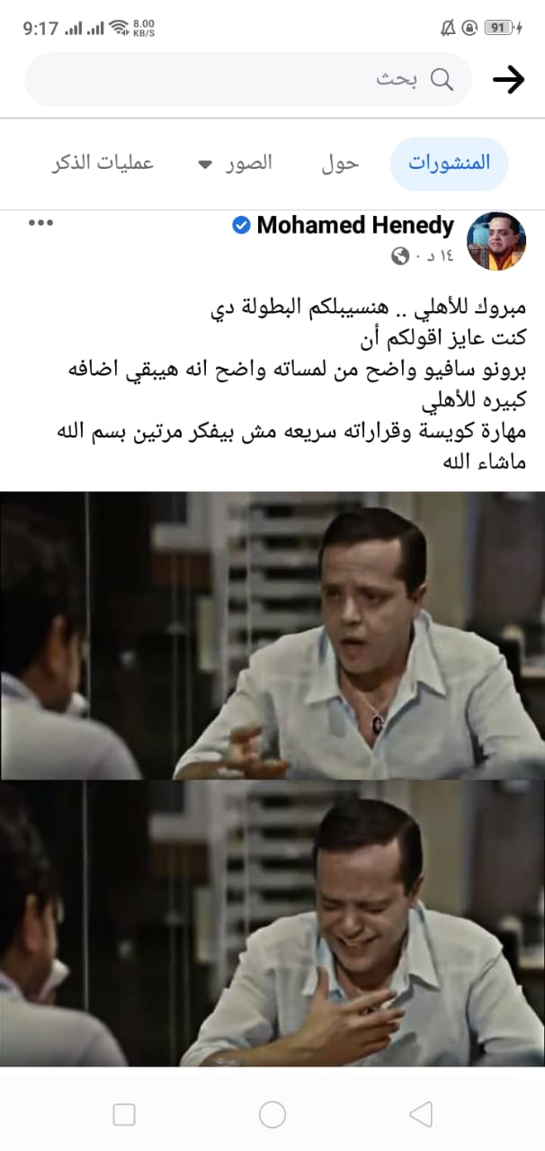 محمد هنيدي يهنئ الأهلى بعد مباراته مع الزمالك