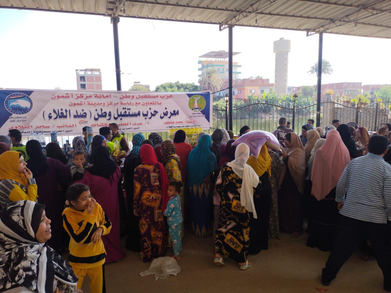 وفي محافظة المنوفية، أقامت أمانة مركز ومدينة أشمون، معرضاً لبيع السلع الغذائية والتموينية للمواطنين، بأسعار مخفضة، وذلك تحت شعار "ضد الغلاء"، في الوحدة الحزبية بعزبة عمرو التابعة للوحدة المحلية بقورص، وشمل المعرض جميع السلع والمنتجات الغذائية والتي تلزم كل بيت من سكر وأرز ومكرونة وزيوت وسمن ودقيق وجبن ومعلبات ومنظفات كما شمل المعرض جميع انواع الورقيات وأيضا لحوم وأسماك مجمده وذلك بأسعار مخفضة، وشهد المعرض إقبالا كثيفا من المواطنين منذ بداية المعرض.