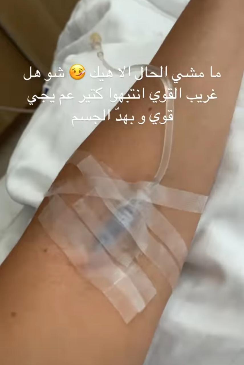 حيث نشرت نادين صورة لذراعها بالمحاليل وعلقت عليها قائلة: "ما مشي الحال إلا هيك.. شو هالغريب القوي انتبهوا كتير عم يجي قوي وبيهد الجسم".