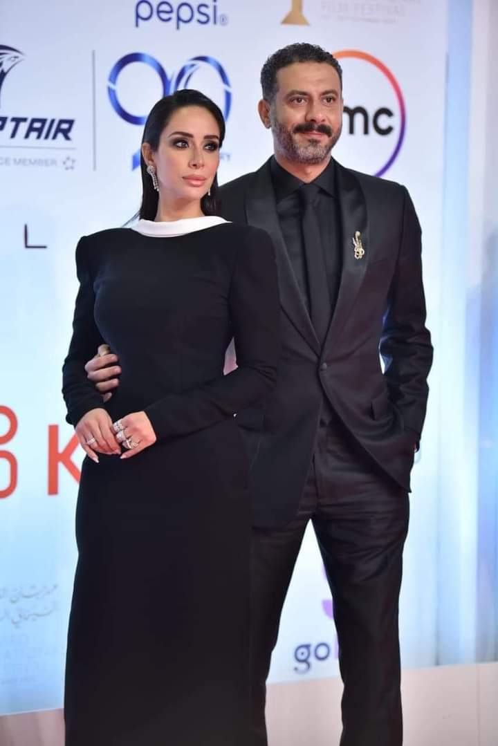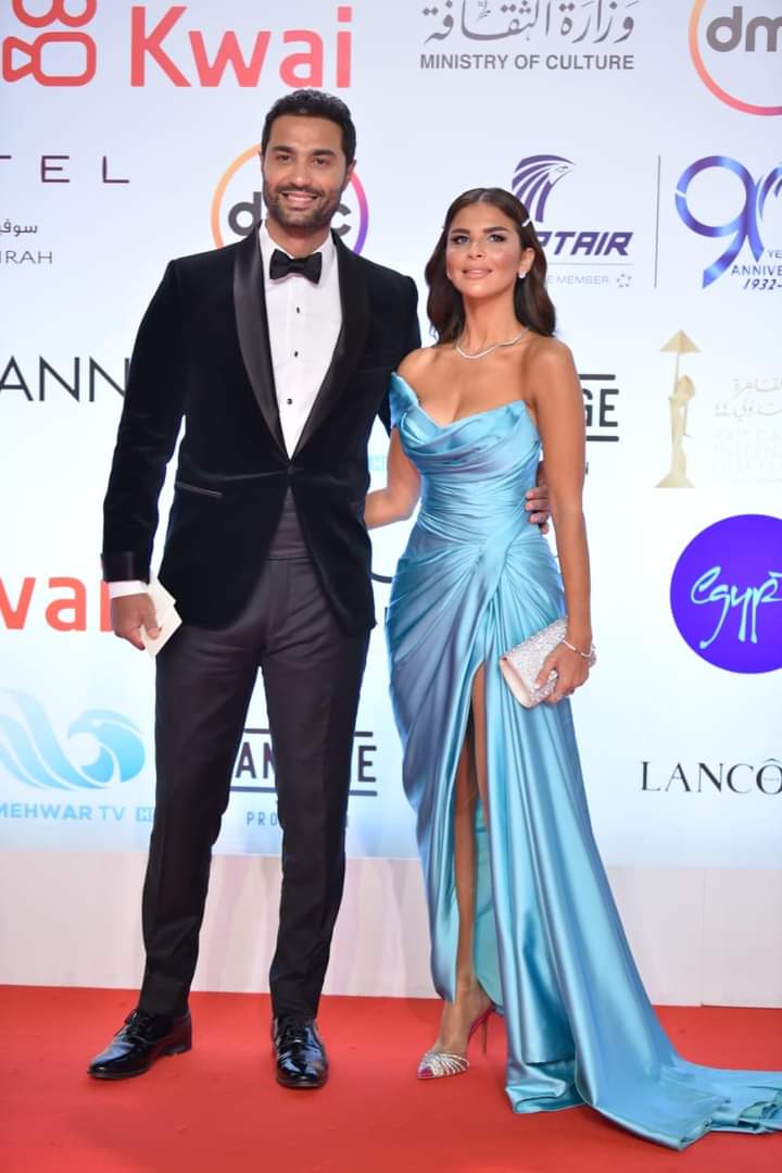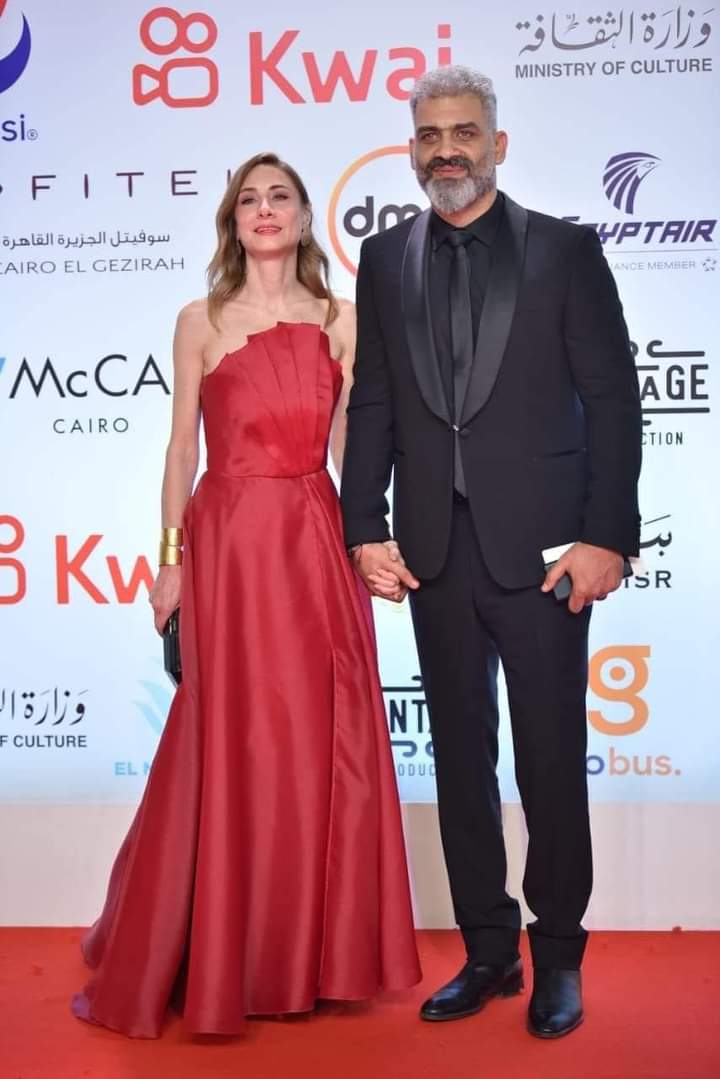 كما تألق الثنائي المميز كريم فهمي وزوجته على السجادة الحمراء بمهرجان القاهرة السينمائي، حيث ظهرت زوجته كريم بإطلالة جريئة بعض الشئ وارتدت فستانا باللون الزهري المكشوف الصدر.