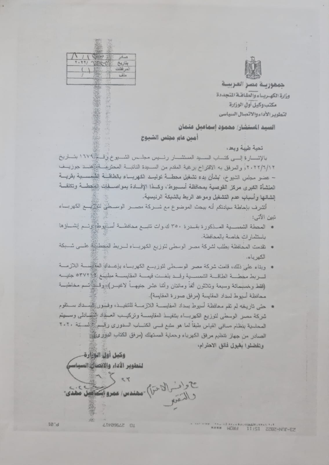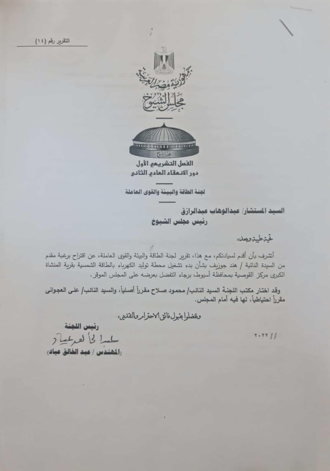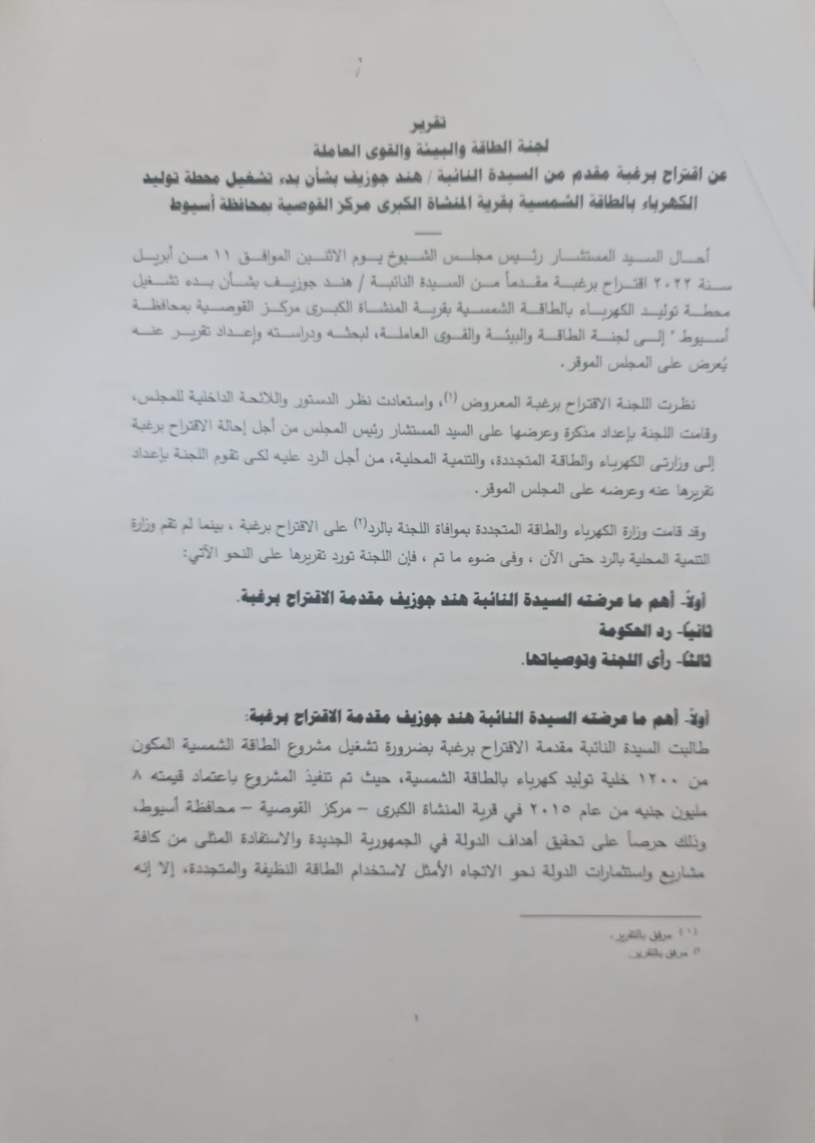 وقد ناقشت أيضاً خلال الاجتماع تشغيل محطة الطاقه الشمسية بالمنشاه الكبرى وانهاء اي مشاكل تخص التشغيل مع توفير التمويل اللازم للتشغيل، فقضية العالم باجمعه هي التغيرات المناخية والأعتماد بشكل نهائي علي مصادر الطاقة المتجددة، الجدير بالذكر أن النائبة هند جوزيف قد تقدمت باقتراح برغبة في هذا الشأن وجاء الرد انه تم مخاطبة المحافظة لسداد المقايسة المطلوبة.