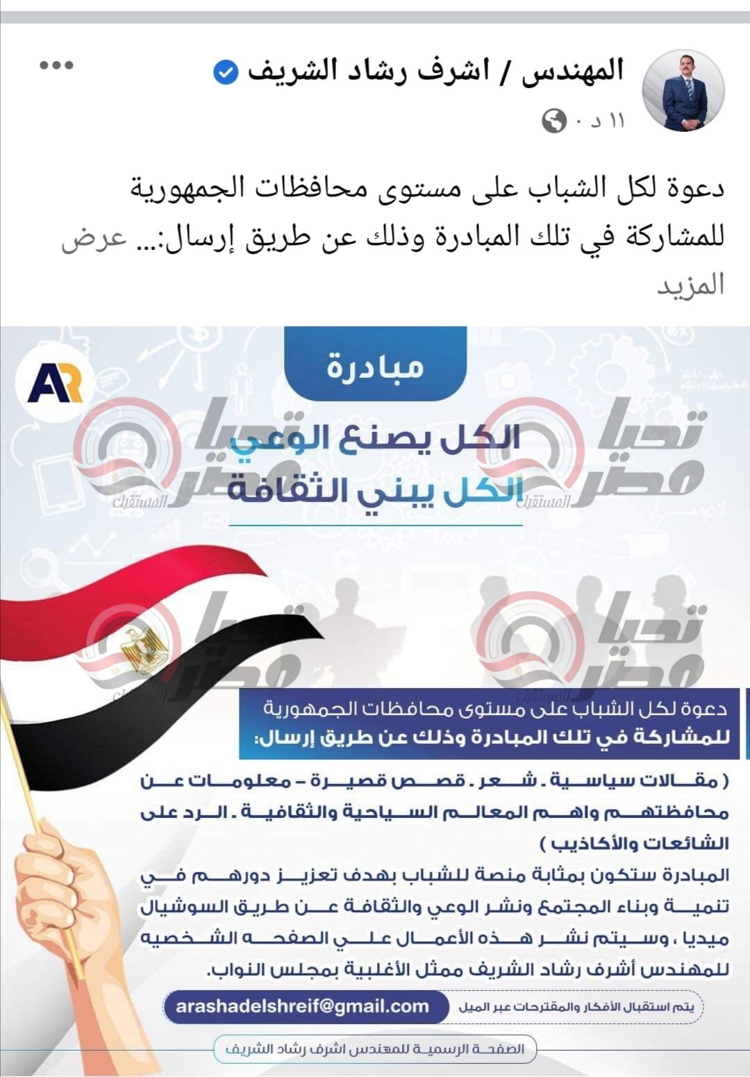 المبادرة ستكون بمثابة منصة للشباب بهدف تعزيـز دورهـم فـي تنميـة وبناء المجتمع ونشـر الوعي والثقافـة عـن طـريـق السوشيال ميديا ، وسيتم نشـر هـذه الأعمـال عـلـي الصفحـه الشخصيه للمهندس أشرف رشاد الشريف ممثل الأغلبية بمجلس النواب.