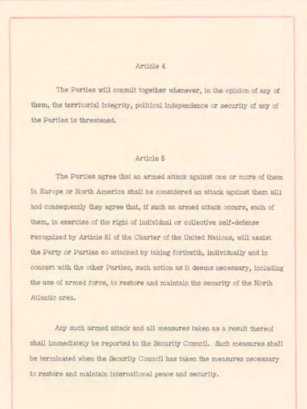 وتنص المادة الخامسة على أن:" أي هجوم أو عدوان مسلح ضد عضو من أعضاء الحلف العسكري يعتبر عدواناً عليهم جمبعاً، وبناء عليه، فأنهم متفقون على حق الدفاع الذاتى عن أنفسهم، المعترف به فى المادة 51 من ميثاق الأمم المتحدة بشكل فردي أو جماعي، وتقديم المساندة للطرف أو الأطراف التى تتعرض للهجوم".