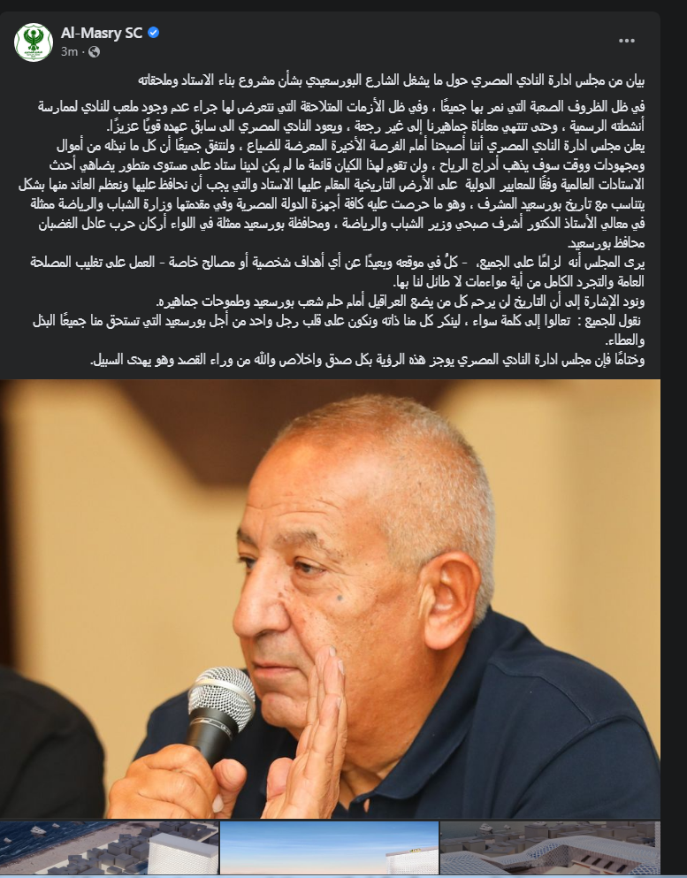 بيان من النادي المصري البورسعيدي بشأن مشروع بناء الاستاد وملحقاته