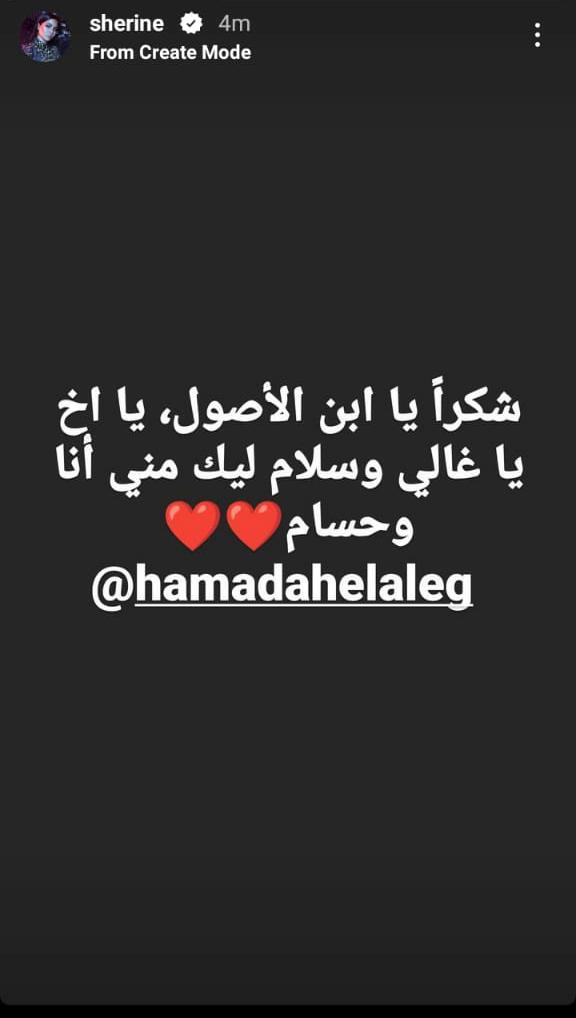 وكتبت شيرين عبر خاصية الاستوري عبر حسابها بموقع تبادل الصور والفيديوهات انستجرام وكتبت: شكرًا يا ابن الاصول، يا أخ يا غالي، وسلام ليك مني انا وحسام.