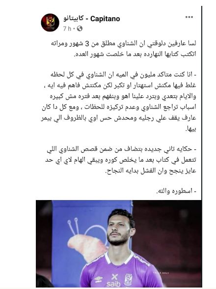 وتصدر خبر الانفصال محركات البحث على مواقع التواصل الاجتماعي، لفترة طويلة، بعد الشائعات القوية التي خرجت من مقربين للاعب تؤكد أن الطلاق قد حدث بين الشناوي وزوجته منذ فترة.