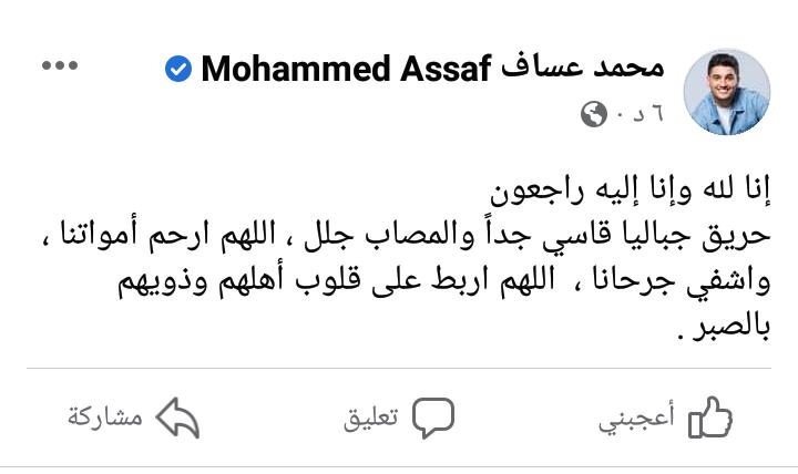 وكتب عساف عبر حسابه بموقع التواصل الاجتماعي فيسبوك: إنا لله وإنا إليه راجعون.. حريق جباليا قاسي جداً والمصاب جلل ، اللهم ارحم أمواتنا ، واشفي جرحانا ، اللهم اربط على قلوب أهلهم وذويهم بالصبر.