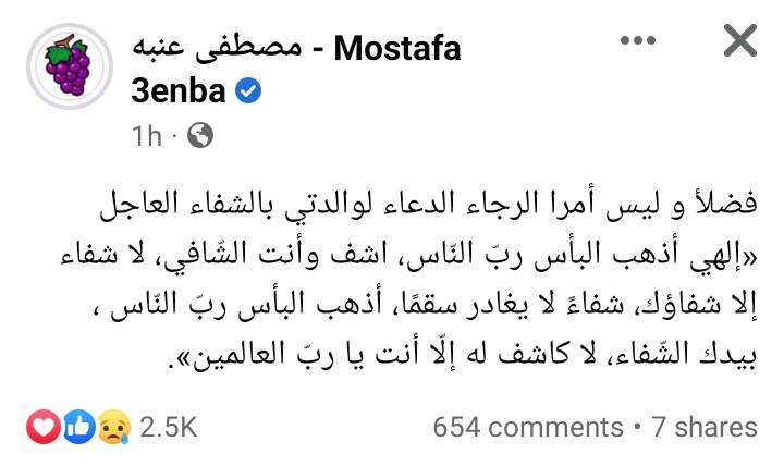كتب عنبة عبر حسابه الرسمي بموقع التواصل الإجتماعي “فيسبوك”: فضلأ و ليس أمرا الرجاء الدعاء لوالدتي بالشفاء العاجل .