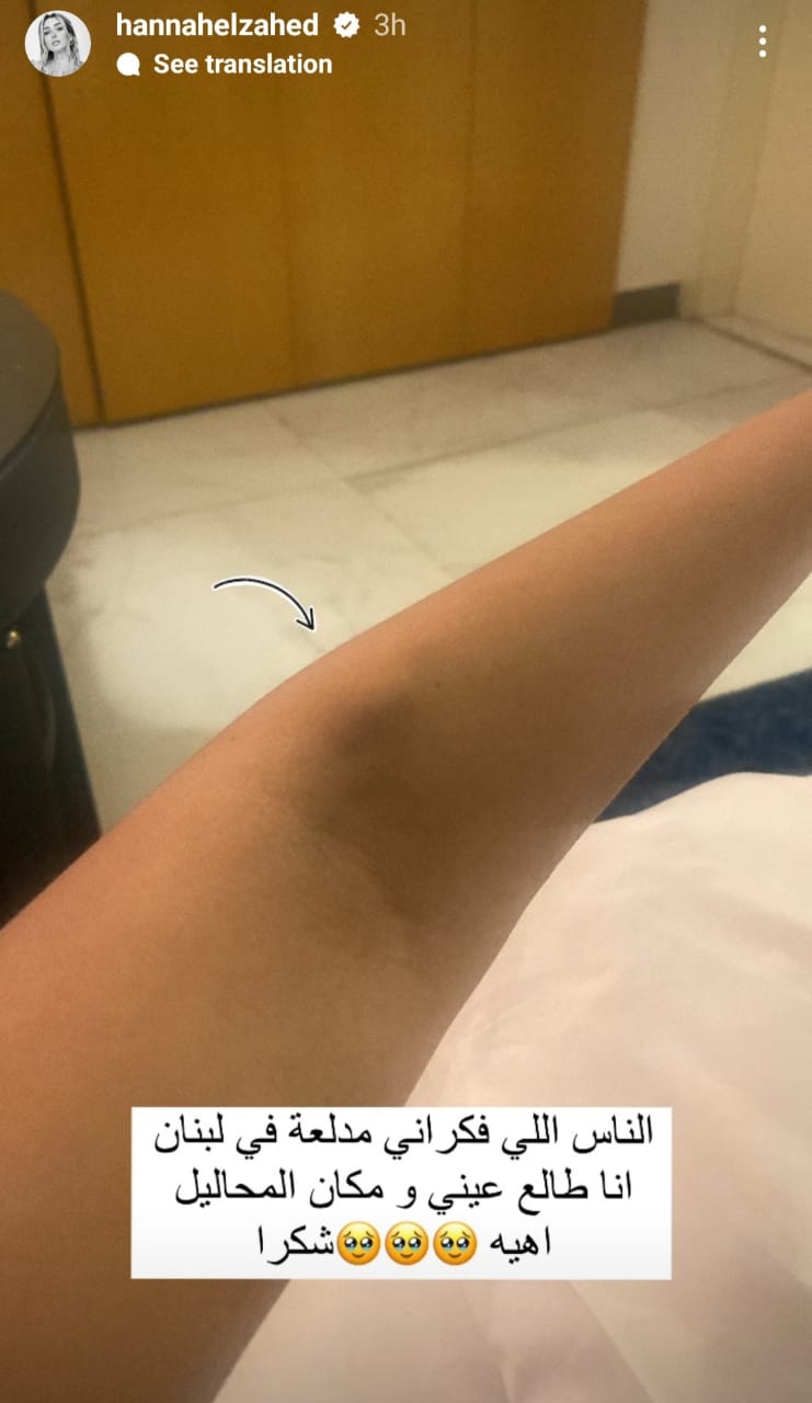 حيث نشرت هنا الزاهد صورة لذراعها توضح أثر المحاليل، وعلقت عليها قائلة: "الناس اللي فكراني متدلعة في لبنان أنا طالع عيني ومكان التحاليل اهيه.. شكرا".