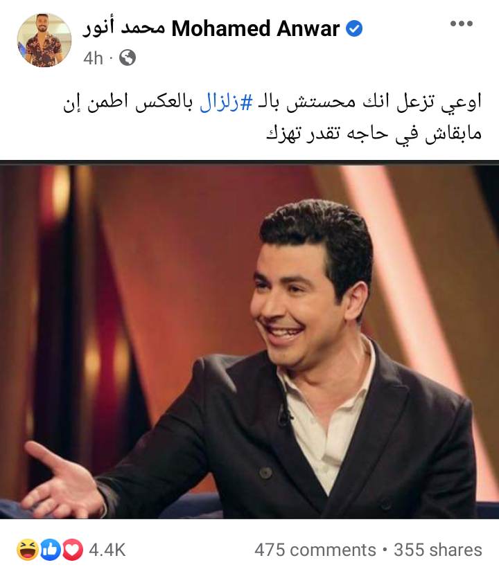 تفاعل عدد كبير من نجوم الفن مع الـ زلزال الذي هز مصر في الساعات القليلة الماضية، اذ جاءت تعليقاتهم ساخرة وطريفة، وكان على رأس هؤلاء الفنان محمد أنور، نجم مسرح مصر الذي كتب عبر حسابه الرسمي بموقع التواصل الإجتماعي “فيسبوك": اوعي تزعل انك محستش بالـ زلزال بالعكس اطمن إن مابقاش في حاجه تقدر تهزك.