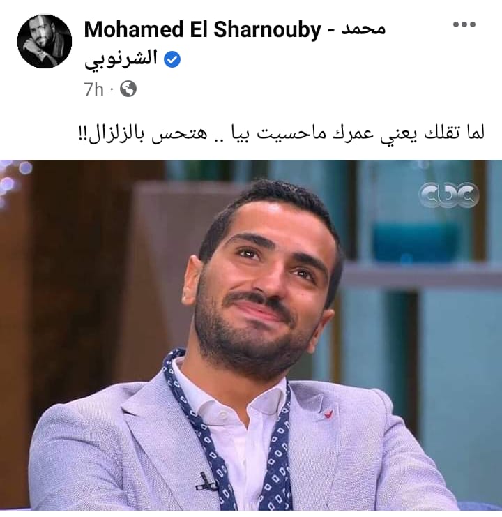 وشارك محمد الشرنوبي صورته الشهيرة في لقائه في برنامج “معكم”، الذي تقدمه الإعلامية منى الشاذلي، وعلق عليها قائلا: لما تقولك يعني عمرك ما حسيت بيا هتحس بالـ زلزال.