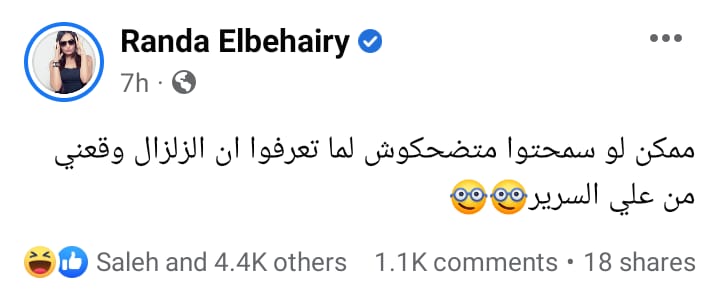 وكشفت راندا البحيري معاناتها مع الـ الزلزل فكتب: ممكن يجماعة متضحكوش لما تعرفوا ان الزلزال وقعني من على السرير.