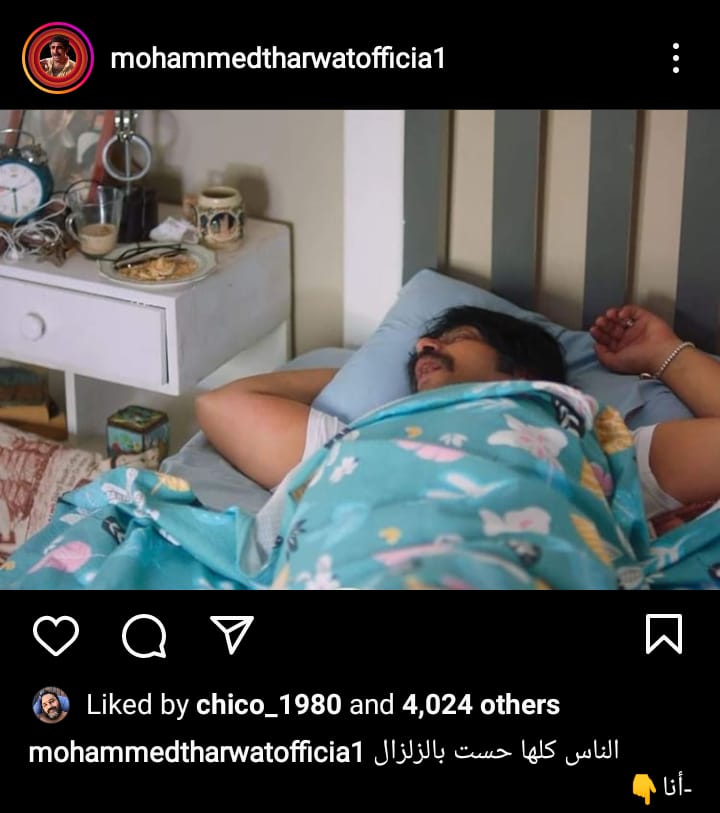 في حين شارك محمد ثروت صورة له من إحدى أعمال الفنية وهو غريق في نومه على سريره، وعلق عليها: الناس كلها حست بالـ زلزال.. أنا:.. ، في إشارة منهم أنه علم بحدث الـ زلزال من السوشيال ميديا.