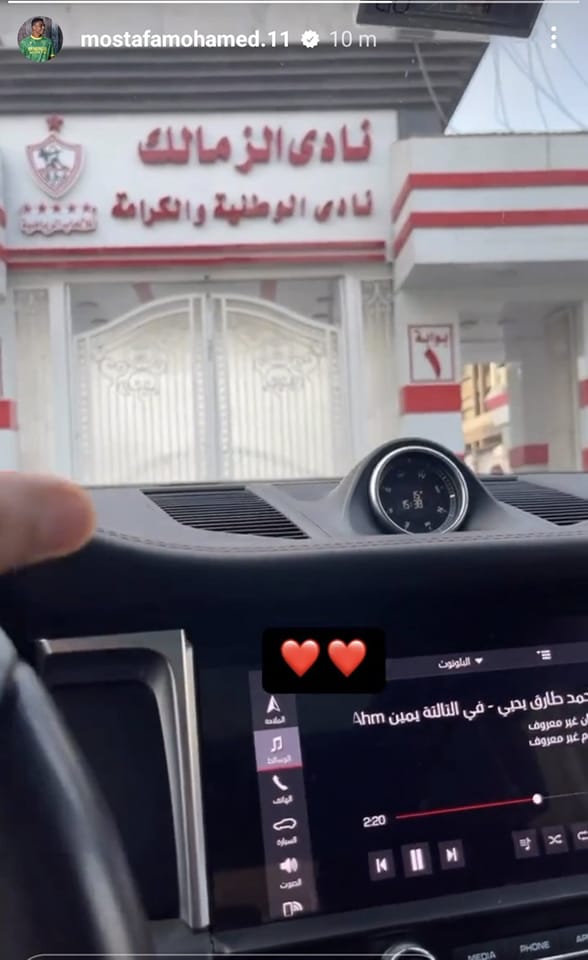 ونشر مصطفى محمد عبر حسابه الرسمي على انستجرام صورة داخل سيارته وهو يتواجد داخل نادي الزمالك ويستمع إلى أغاني ناديه السابق.