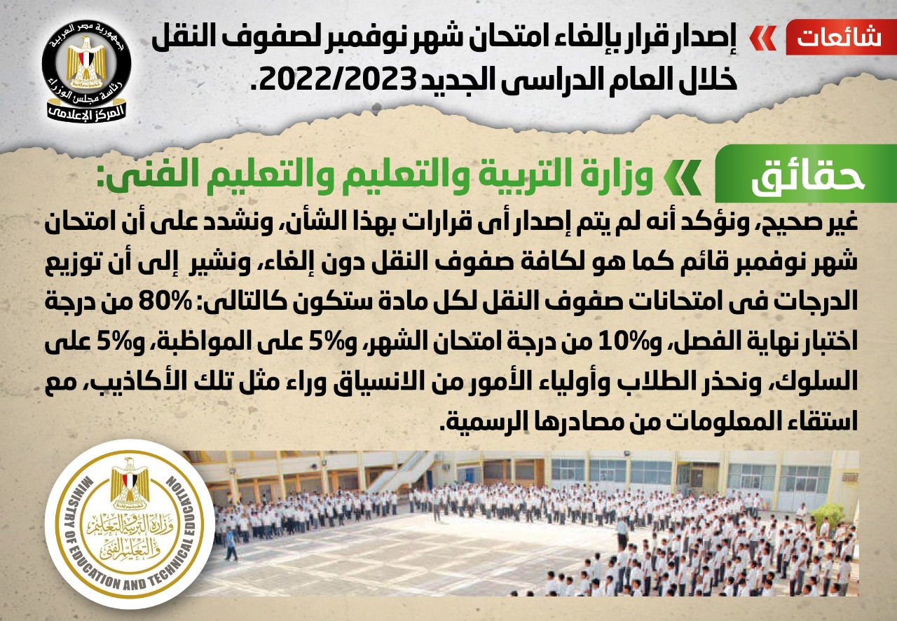 وقد قام المركز الإعلامي لمجلس الوزراء بالتواصل مع وزارة التربية والتعليم والتعليم الفني، والتي نفت تلك الأنباء، مُؤكدةً أنه لا صحة لإلغاء امتحان شهر نوفمبر لصفوف النقل خلال العام الدراسي الجديد 2022/2023، وأنه لم يتم إصدار أي قرارات بهذا الشأن، مُشددةً على أن امتحان شهر نوفمبر قائم كما هو لكافة صفوف النقل دون إلغاء، مُشيرةً إلى أن توزيع الدرجات في امتحانات صفوف النقل لكل مادة ستكون كالتالي: 80% من درجة اختبار نهاية الفصل، و10% من درجة امتحان الشهر، و 5% على المواظبة، و5% على السلوك، مُحذرةً الطلاب وأولياء الأمور عدم الانسياق وراء مثل تلك الأكاذيب، مع استقاء المعلومات من مصادرها الرسمية.