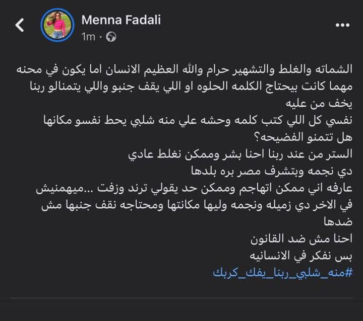 وكتبت منة عبر حسابها بموقع التواصل الاجتماعي فيسبوك: الشماتة والغلط والتشهير حرام والله العظيم.. الإنسان إما يكون في محنة مهما كانت بيحتاج الكلمة الحلوة أو اللي يقف جنبه واللي يتمنالوا ربنا يخفف من عليه.