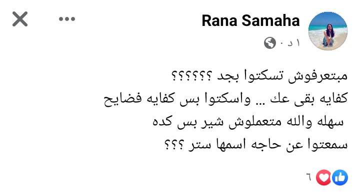 وكتبت رنا عبر حسابها بموقع التواصل الاجتماعي فيسبوك: مبتعرفوش تسكتوا بجد.. كفايه بقى عك… واسكتوا بس كفايه فضايح سهله والله متعملوش شير بس كده سمعتوا عن حاجه اسمها ستر.