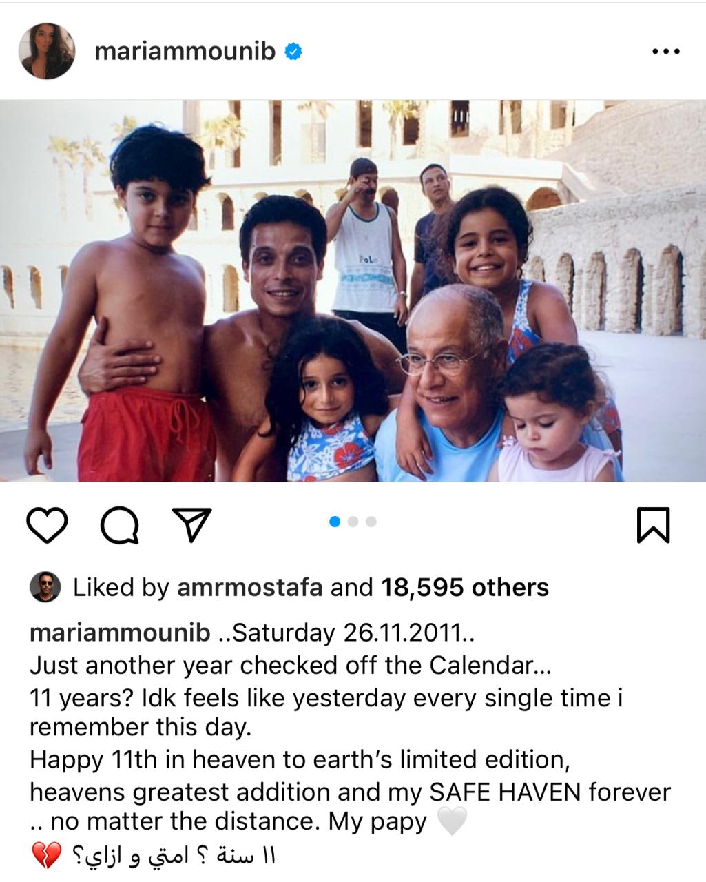 ونشرت مريم عامر منيب صور وفيديوهات تجمعها بوالدها عبر انستجرام، وعلقت: السبت 26 نوفمبر 2011، سنة تانية عدت.. 11 سنة؟ حاسه انه كان امبارح ودايمًا فاكرة اليوم ده، سنة 11 سعيدة في الجنة.. 11 سنة! امتي وازاي؟.