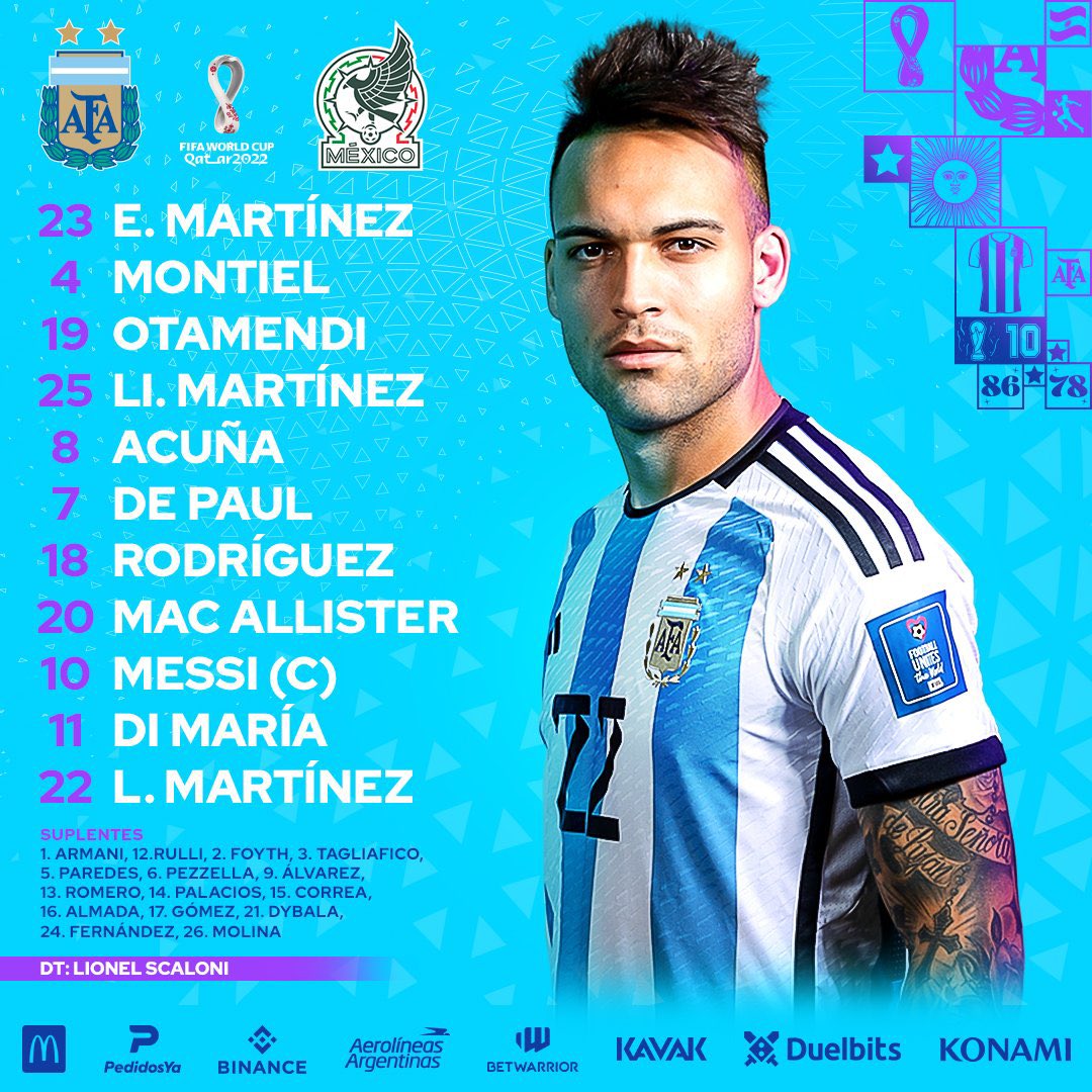 أعلن الجهاز الفني لكلا من منتخب الأرجنتين ومنتخب المكسيك التشكيل الرسمي لمبارتهما التي ستقام في التاسعة من مساء اليوم السبت على ملعب "لوسيل"، ضمن منافسات الجولة الثانية من منافسات المجموعة الثالثة في بطولة كأس العالم 2022 المقامة حالياً في قطر وتستمر حتى الثامن عشر من شهر ديسمبر القادم بمشاركة 32 منتخباً من مختلف القارات الست.