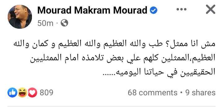 وكتب مكرم عبر فيسبوك: مش أنا ممثل؟ طب والله العظيم والله العظيم وكمان والله العظيم، الممثلين كلهم على بعض تلامذة أمام الممثلين الحقيقيين في حياتنا اليومية.