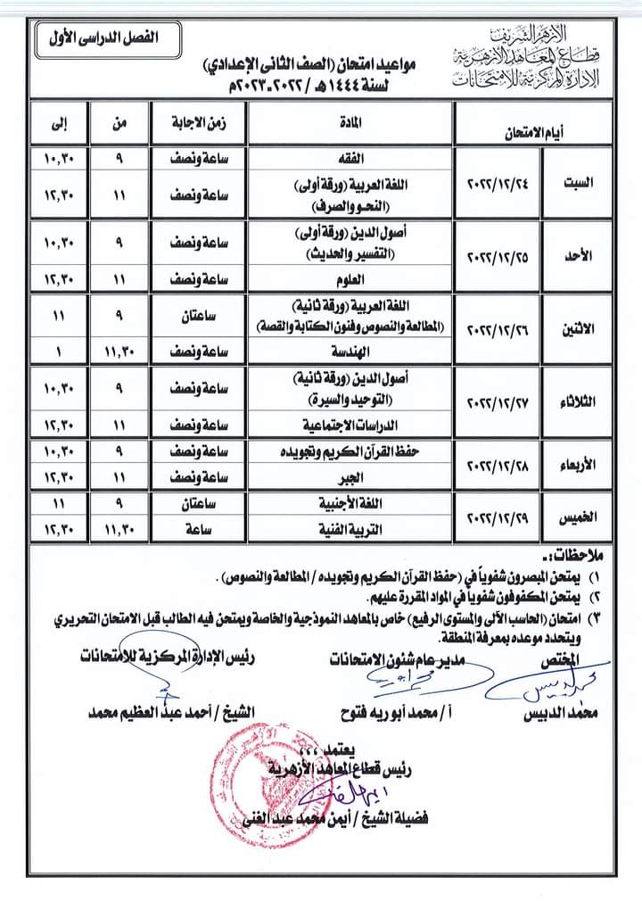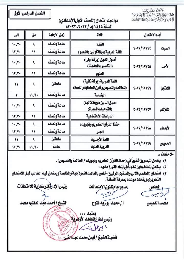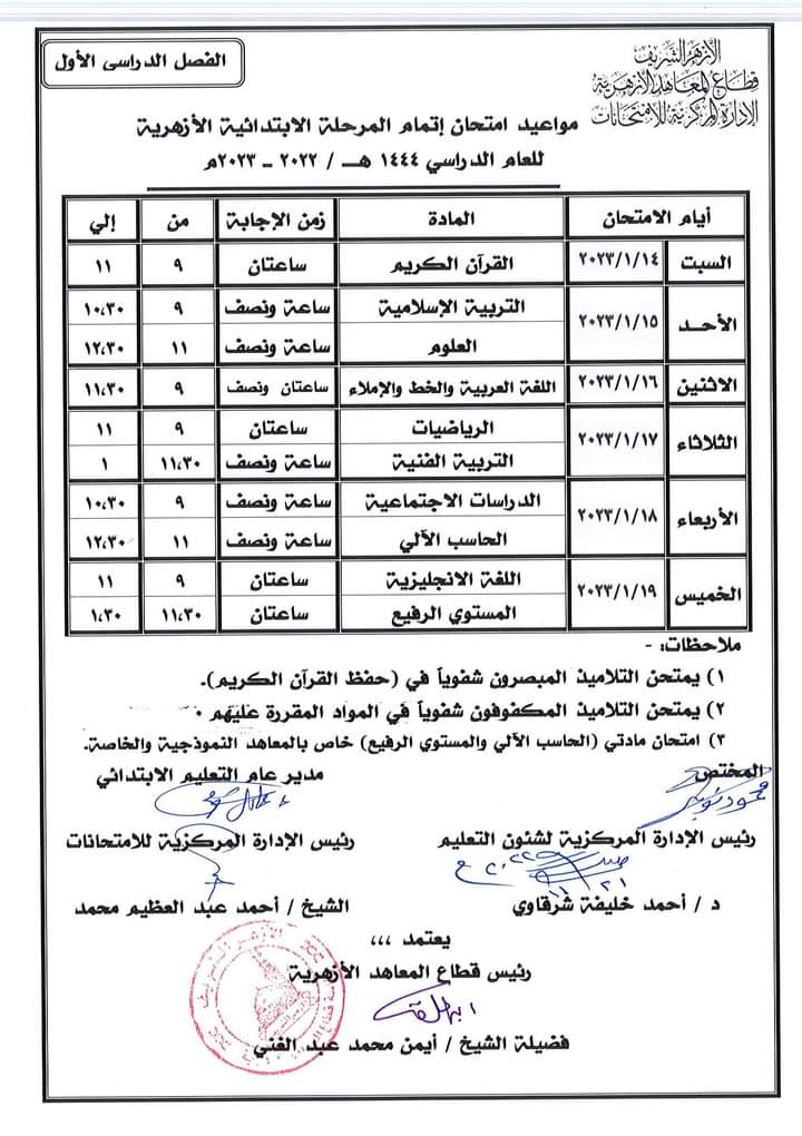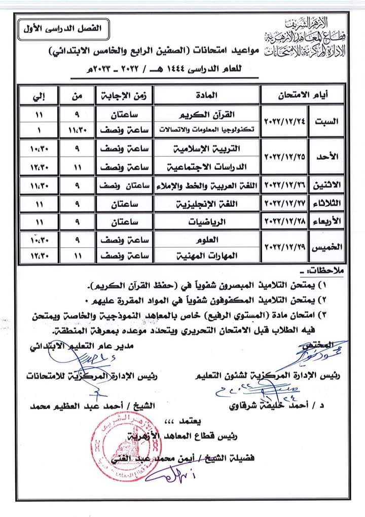 جداول امتحانات نصف العام لصفوف النقل بالأزهر والشهادتين الابتدائية والإعدادية