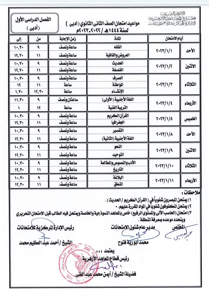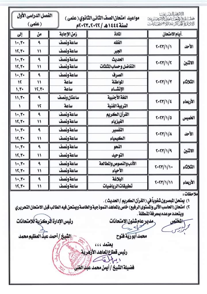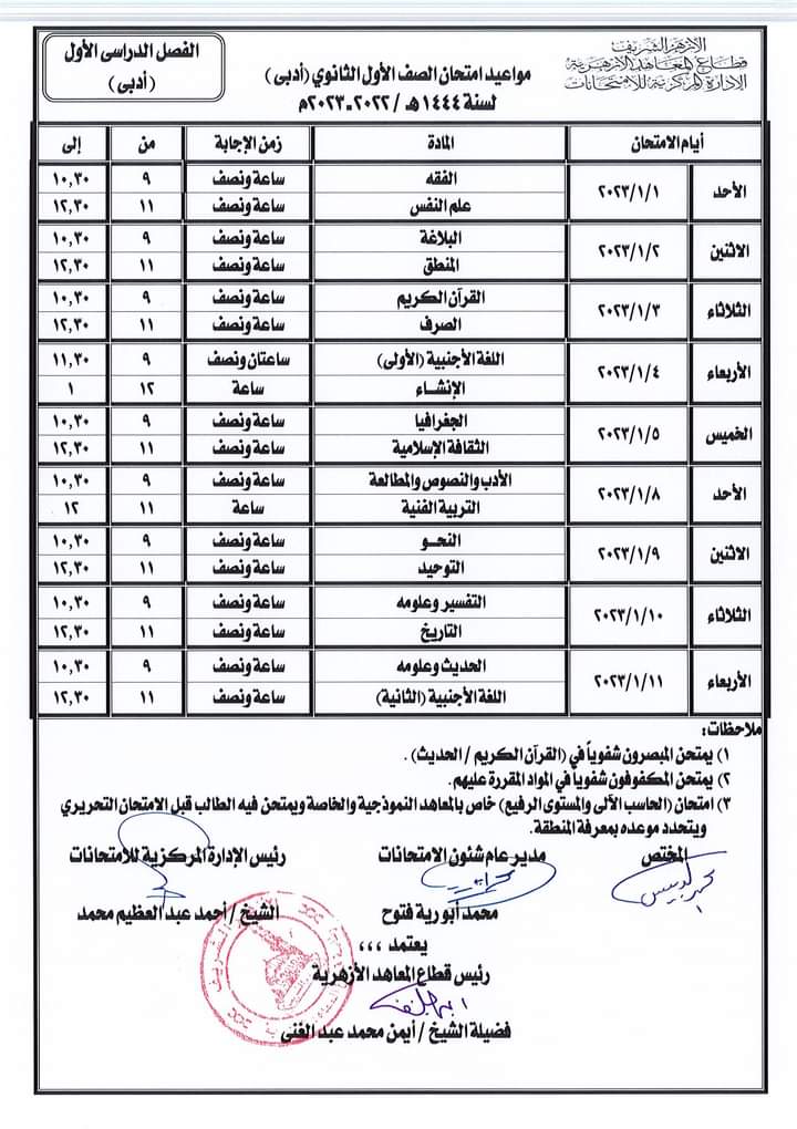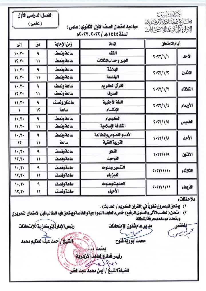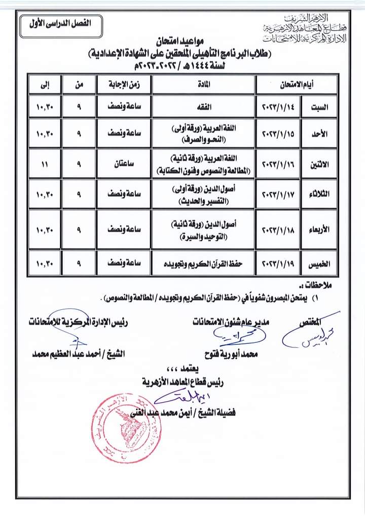جداول امتحانات نصف العام لصفوف النقل بالأزهر والشهادتين الابتدائية والإعدادية