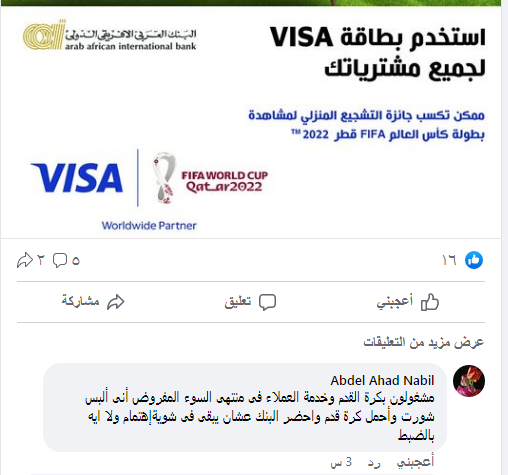 وقال أحد عملاء البنك العربى الافريقى عبر صفحته الرسمية على موقع "فيسبوك،: "مشغولون بكرة القدم وخدمة العملاء فى منتهى السوء المفروض أنى ألبس شورت وأحمل كرة قدم وأحضر البنك عشان يبقى فى شوية اهتمام ولا إيه بالضبط".