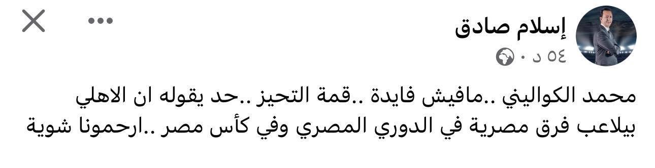 وكتب إسلام صادق عبر حسابه الرسمي على فيس بوك: «محمد الكواليني ..مافيش فايدة ..قمة التحيز ..حد يقوله أن الأهلي بيلاعب فرق مصرية في الدوري المصري وفي كأس مصر ..ارحمونا شوية».
