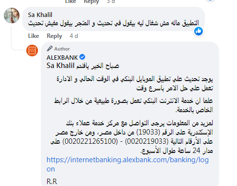 رد موظف بنك الاسكندرية على شكوى العميل قائلاً : "يوجد تحديث علي تطبيق الموبايل البنكي في الوقت الحالي والإدارة تعمل على حل الأمر بأسرع وقت".