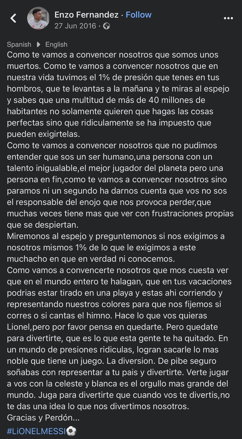 دون الشاب إنزو فيرنانديز في حسابه الشخصي على موقع التواصل الاجتماعي فيسبوك رسالة عاطفية إلى ميسي، اتسمت بالرغبة الصادقة من جانب الشاب فيرنانديز، بدأها بالتالي: "كيف سنقنعك أننا أموات، أنه في حياتنا عانينا 1٪ فقط من الضغط الواقع على كتفيك الآن".