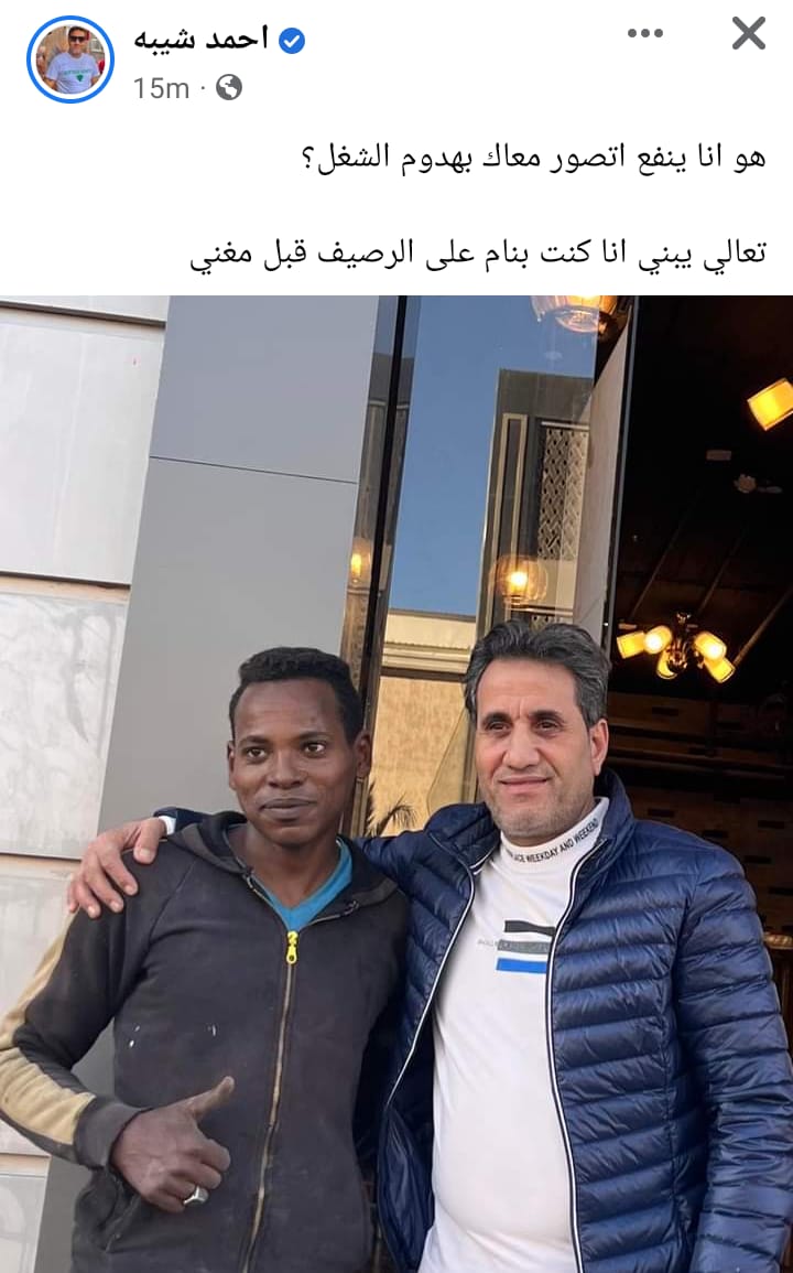 شارك أحمد شيبة صورة له مع معجب طلب التصوير معه، وعلق عليها، راوية أحداث الموقف: هو انا ينفع اتصور معاك بهدوم الشغل؟.. تعالى يبني انا كنت بنام على الرصيف قبل مغني.