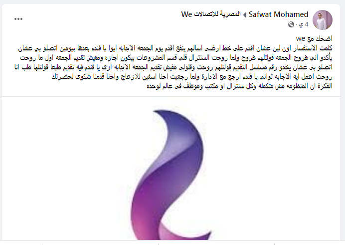 قال أحد عملاء المصرية للاتصالات We على صفحة الشركة على موقع "فيسبوك"،: "اضحك مع we كلمت الاستفسار اون لين عشان اقدم على خط أرضى اسالهم ينفع أقدم يوم الجمعة الإجابة أيوة يا فندم بعدها بيومين اتصلو بي عشان يأكدو إنى هروح الجمعة قولتلهم هروح".