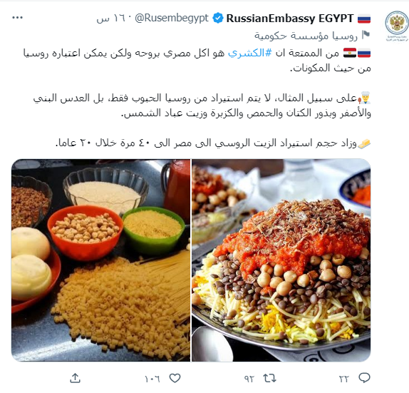 وقالت السفارة الروسية فى تغريدة لها أن:" أكلة الكشري هى مصرية بروحها، لكن يمكن اعتبارها روسية من حيث المكونات، نظراً لأستيراد العديد من مكوناتها من روسيا".