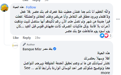 قال أحد عملاء بنك مصر في تعليق على صفحة المصرف الرسمية على موقع "فيسبوك"،: "والله العظيم أنا نادم جدًا عشان حطيت شقا عمرى فى بنك مصر فلا عمل ولا اهتمام وبرود مطلق فى التعامل وأنا مريض وعلى المعاش والمشكلة".
