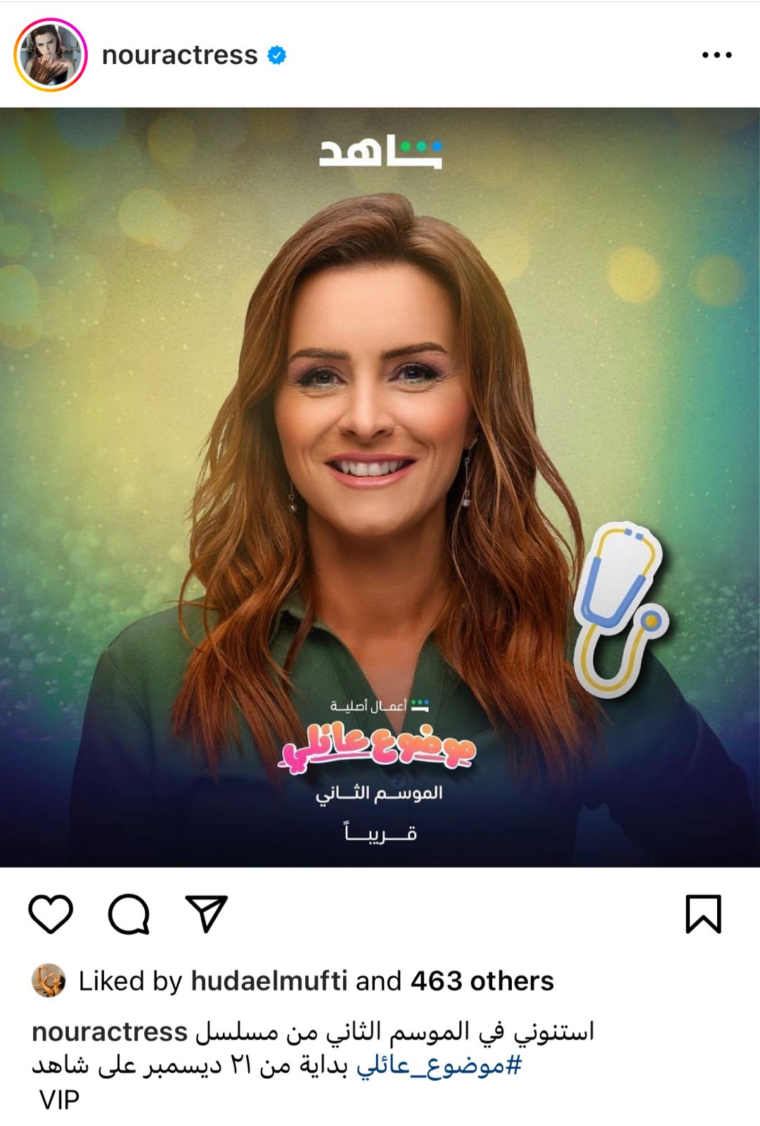 شوقت الفنانة نور جمهورها للموسم الثاني من مسلسل “موضوع عائلي” وذلك عبر حسابها الرسمي بموقع تبادل الصور والفيديوهات الشهير انستجرام.