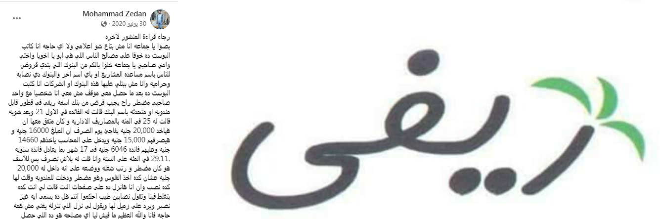 قال أحد المواطنين عن شركة ريفى على موقع "فيسبوك"،: "بصوا يا جماعة أنا مش بتاع شو اعلامي ولا اي حاجه انا كاتب البوست ده خوفا على مصالح الناس اللي هي ابو يا اخويا واختي وامي صاحبي يا جماعة خلوا بالكم من البنوك اللي بتدي قروض للناس باسم مساعده المشاريع او باي اسم اخر والبنوك دي نصابة وحرامية وانا مش ببتلي عليها هذه البنوك أو الشركات انا كتبت البوست ده بعد ما حصل معي موقف مش معي انا شخصيا مع واحد صاحبي مضطر راح يجيب قرض من بنك اسمه ريفي في قطور قابل مندوبة أو متحدثة باسم البنك قالت له الفائدة في الاول 21 وبعد شويه قالت له 25 في المئة بالمصاريف الادارية و كان متفق معها أن هياخد 20,000 جنيه يفاجئ يوم الصرف ان المبلغ 16000 جنيه وهيصرفهم 15,000 جنيه ويدخل على المحاسب ياخذهم 14660 جنيه وعليهم فائده 6046 جنيه في 17 شهر بما يعادل فائده سنويه .29.11 في المئدة على السنة".